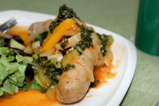 1. In a large skillet heat 1 tbsp of oil. Add about 1/4 cup water and the sausages. Cook the sausages and then transfer to a plate.